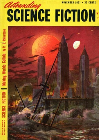 Fritz Leiber’s classic a “A Pail of Air” reminds me of the film When Worlds Collide, because they each have a roaming astronomical body coming into our solar system and changing life on Earth. In Leiber’s story, a dark star pulls Earth out past the orbit of Pluto, and in When Worlds Collide, a movie based on the 1933 book by Philip Wylie and Edwin Balmer, two planets from outside our system get captured by the Sun, and one destroys the Earth. Ever since I’ve been reading science fiction as a kid I’ve been living with hundreds of ideas on how our world might be destroyed. I guess that’s no big deal because before science fiction, religious people lived with the idea that God would stomp our world. Maybe science fiction end of the world stories are just variations on biblically inspired end of the world tales. However, to me, rogue stars and atomic wars seemed far more real than the wrath of God.