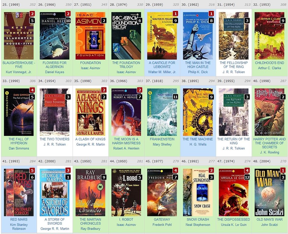 Looking at Worlds Without End list of most read books it’s interesting that among the top 24 books, 15 have been filmed.  These are both SF and fantasy.  Of the ones not filmed, they are: