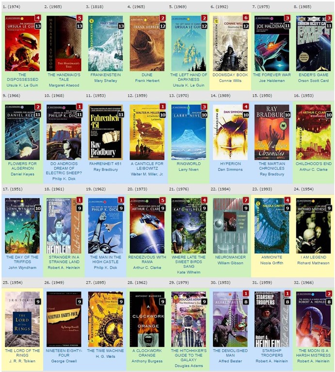 I’ve had two essays published at SF Signal in April. The first, “The Biographies of Philip K. Dick” is about the many books written about PKD. Duh! Titles are important. The second, “How Well-Read Are You in Science Fiction?” serves two purposes. First, it asks how many classic science fiction books do you have to read to feel like an expert. Second, it describes how to use the Worlds Without End’s database to catalog the science fiction books you’ve read, which then allows you to see how you stack up on more than fifty “Best SF/F/H Books” lists. Read the article if you want to learn how, it’s a lot of fun to use the WWEnd database. Here’s an illustration of how well I did with their “WWEnd Top Listed” list. It’s color coded. Blue and green are books read, with blue being favorites, yellow means the book is on my to-be-read list. Orange means I’m reading that book currently. Yeah, I’m embarrassed to let people know I’ve never read I Am Legend by Richard Matheson or Doomsday Book by Connie Willis – but I own both.