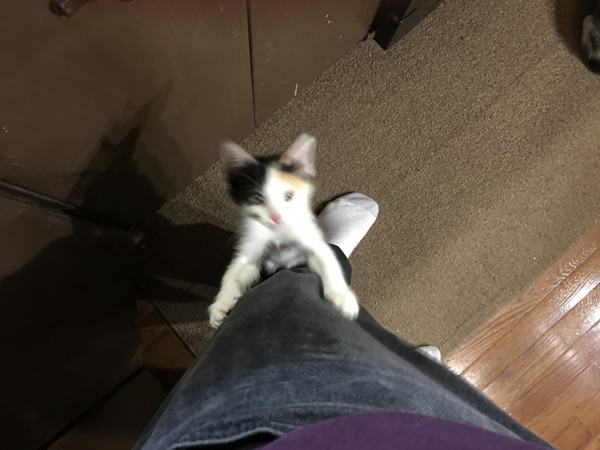 She’s a very determined tiny little kitten. But as she got to my waist, she saw a whole new world of the kitchen countertops. We’ve been worried when they were going to discover the counters. They’re already climbing higher and higher on everything.