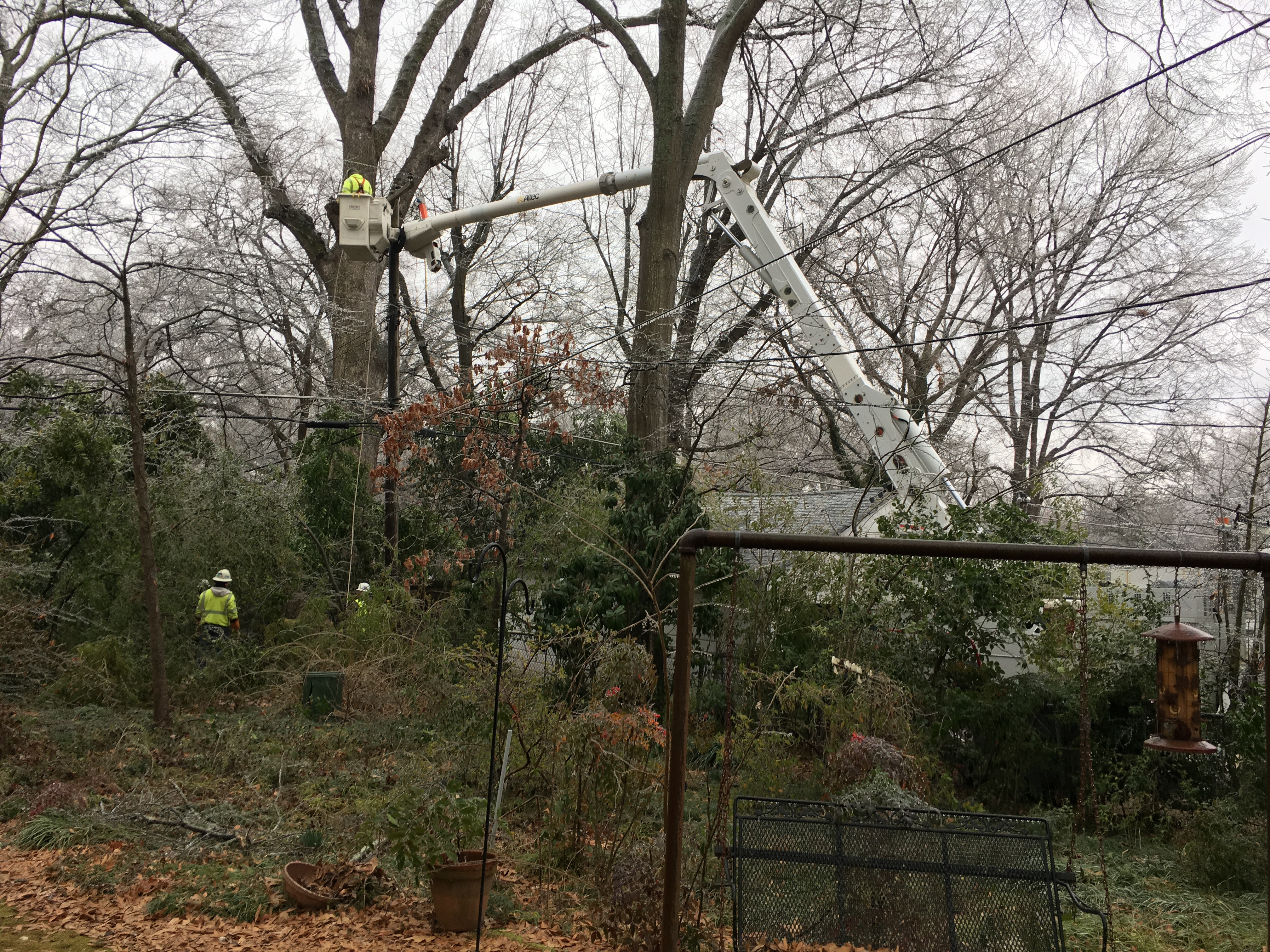 Here’s our rescuers working on a power pole in our backyard with their truck in my neighbor’s yard. It’s hard to see, but everything is covered with ice. That was last Friday. The power went off again for a few hours on Saturday when a tree branch fell on a powerline around the corner.