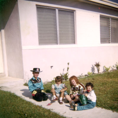 So this puts me in Hollywood, Florida for the first half of 1958. That was at the Lake Forest subdivision house that I remember as being the first house my parents bought. That memory of ownership might not be true since its just a childhood impression. Some of my all-time favorite memories come from living at that Lake Forest house. [Here it is. Becky and I are wearing cowboy outfits. I’m guessing Christmas 1958.]