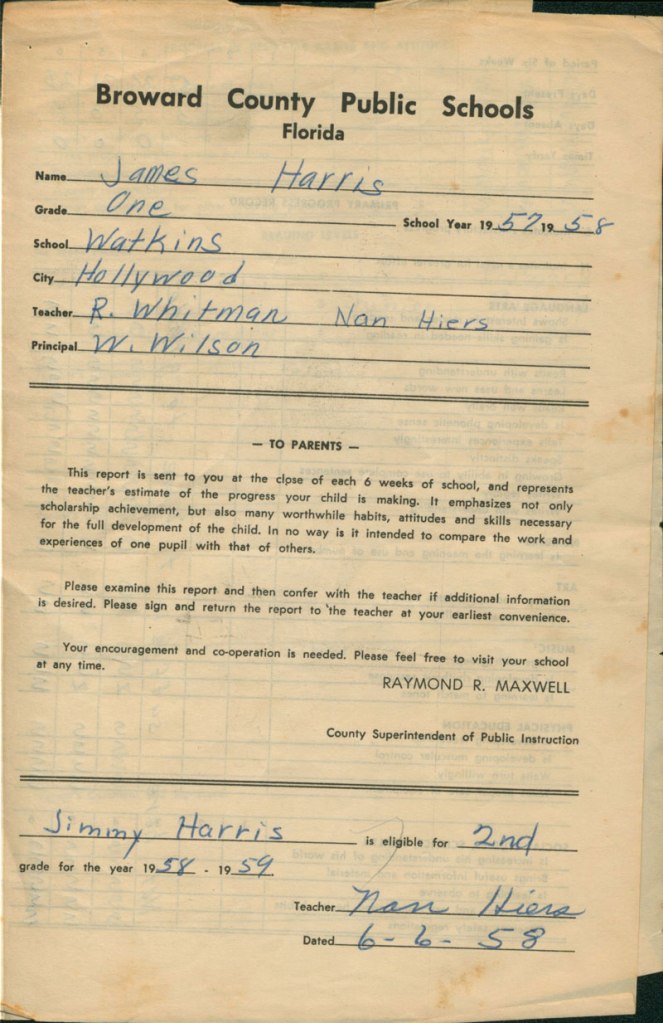 The next clue I found was the report card from the third 1st grade school I attended, Watkins Elementary in Hollywood, Florida. It has me finishing the year dated 6/6/58. I transferred there during the third six-week period in 1957.