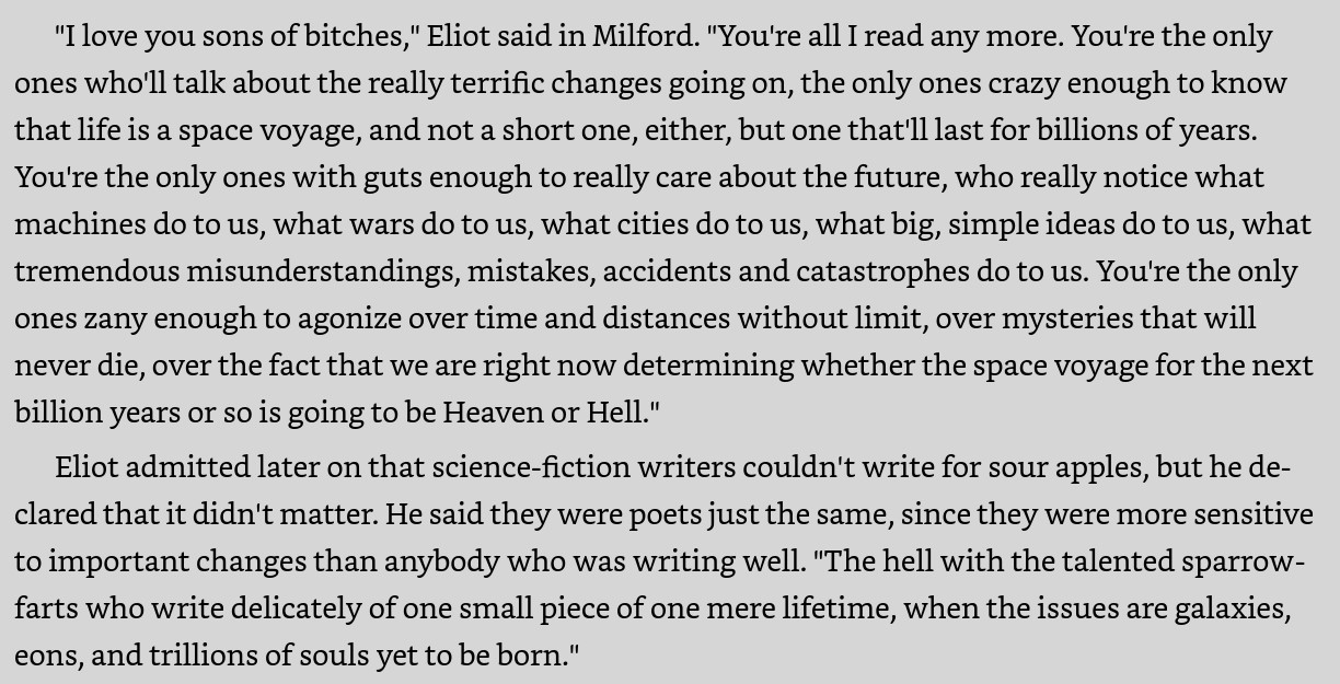 These aliens are like Zen Masters. Vonnegut uses them as enlightened teachers. But then, he gives a rather pitiful assessment of science fiction with his portrayal of Kilgore Trout. However, in a later novel, God Bless You, Mr. Rosewater, where Kilgore Trout is again featured, its hero, Elliot Rosewater attends a science fiction convention and gives this speech.