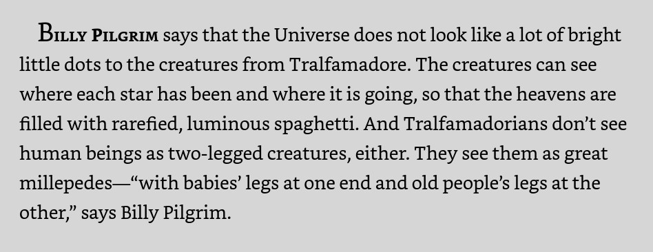 This time around I’ve been thinking more about the Tralfamadorians, the alien race who kidnaps Billy Pilgrim in a flying saucer and takes him to their home world where they exhibit him in a zoo. The Tralfamadorians don’t see time like we do. Existence is all of one piece.