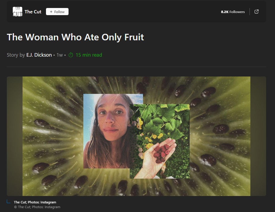 I recently read the article “The Woman Who Only Ate Fruit,” which made me think about why we do things because of our beliefs. The piece was about a Polish woman, Karolina Krzyzak, who died at a resort in Bali because she believed in only eating fruit. It turns out that Bali is a popular destination for people following a vegan lifestyle. Krzyzak followed an even more restrictive diet than veganism, where people only ate fruit.
