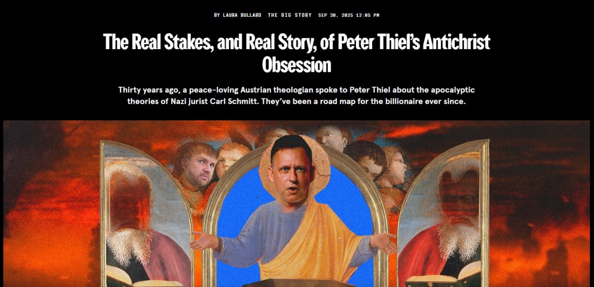 According to some Christian traditions, the Antichrist is a figure that will unify humanity under one rule before delivering us to the apocalypse. For Thiel, its evil is pretty much synonymous with any attempt to unite the world. “How might such an Antichrist rise to power?” Thiel asked. “By playing on our fears of technology and seducing us into decadence with the Antichrist’s slogan: peace and safety.” In other words: It would yoke together a terrified species by promising to rescue it from the apocalypse.