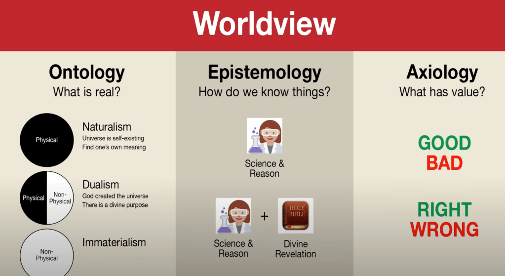 Baker claims that a worldview has three factors, ontology, epistemology, and axiology. From that I see my ontology is naturalism, my epistemology is science and reason, and my axiology is ethics. That particular combination is generally a humanistic worldview.