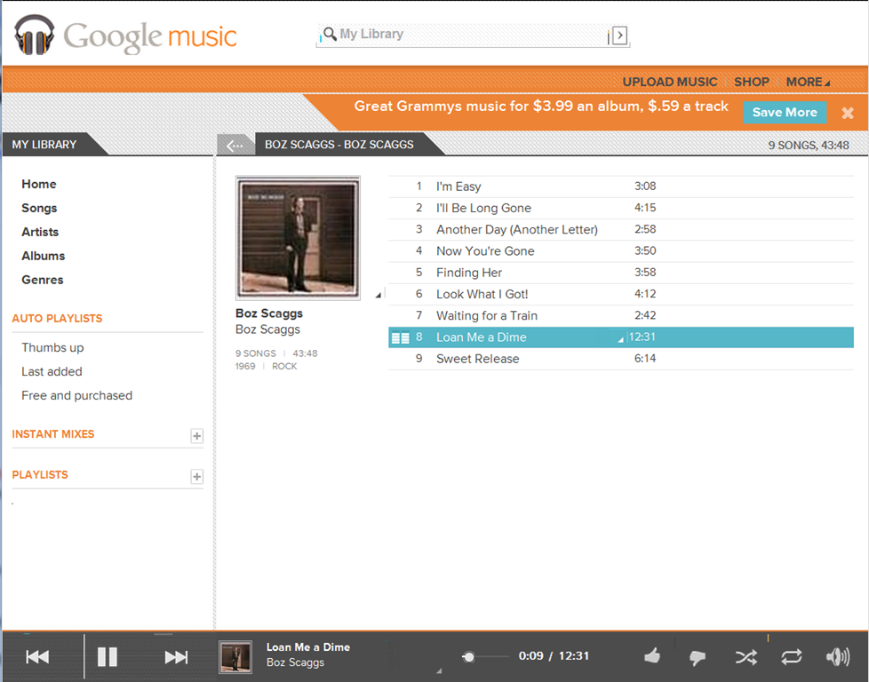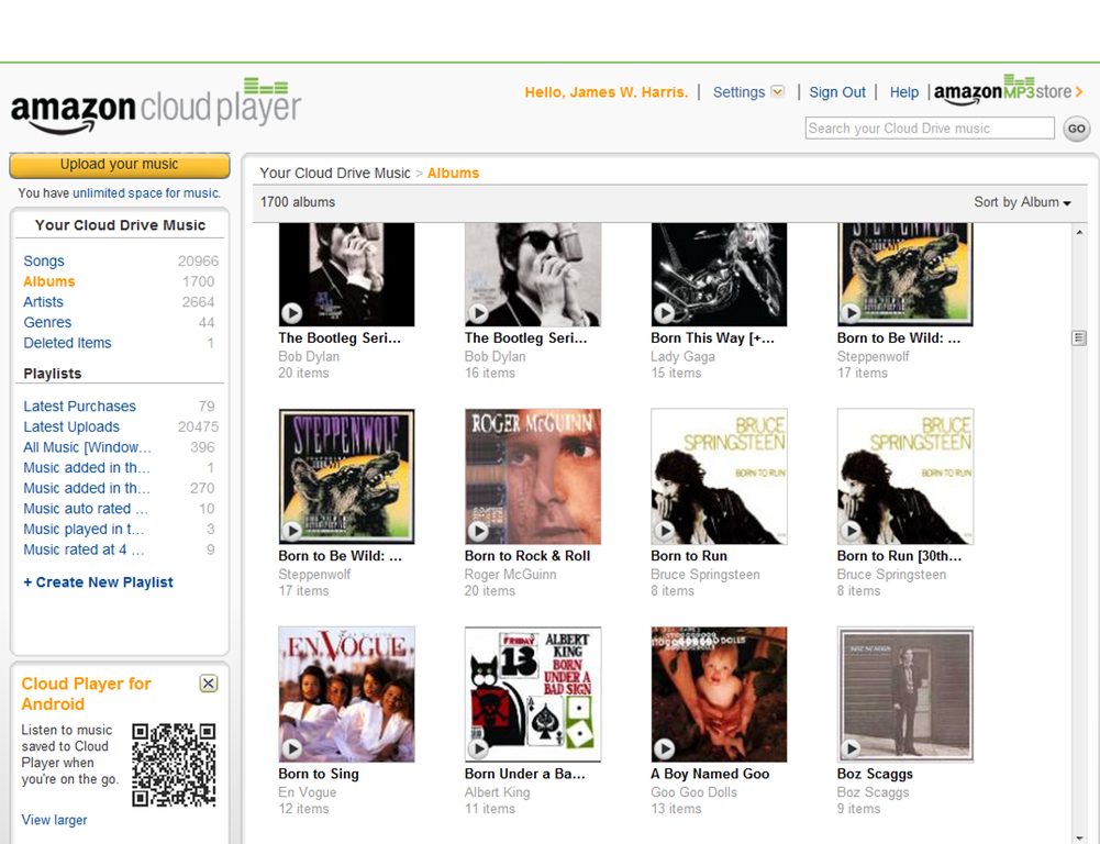 Because iTunes Music Match costs $25 a year, and it’s from Apple, which has a reputation for style and slickness, I thought I would like it best.  I didn’t.  I like it least because it’s tied to iTunes.  The music match feature worked beautifully, and within minutes 15,000 of my albums were online.  It took two days to upload 3,350 unmatched albums.  This is a more sophisticated way to get albums into the cloud, but playing them is limited to machines with iTunes.