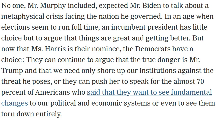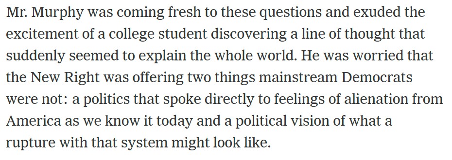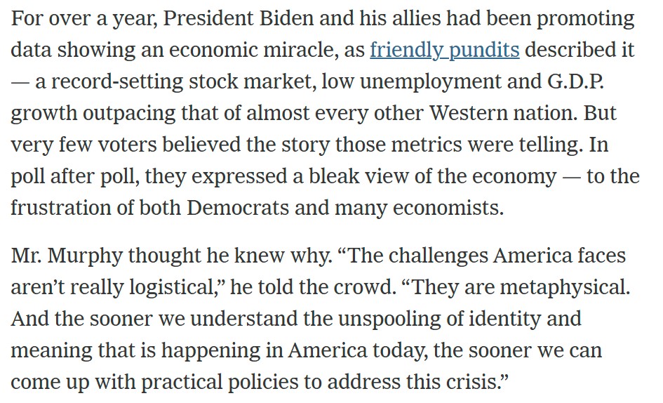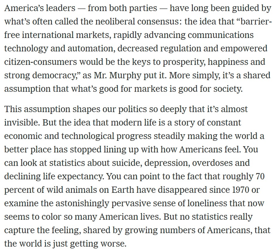 Murphy brings up Project 2025 but is that really a solution to the spiritual crisis he’s pointing at? Ever since FDR and the New Deal, Republicans have been wanting to undo it, and LBJ’s Great Society too. But wasn’t Neoliberalism a response to the Great Depression? But does Project 2025 offer a solution to Murphy’s problem? Isn’t it just consolidating power. It doesn’t claim to undo neoliberalism. Although, it hopes to rewind our sociological makeup back to the 1920s.