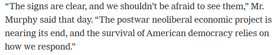 On Monday, August 19th, the New York Times ran a guest editorial by James Pogue about Senator Chris Murphy of Connecticut, entitled “The Senator Warning Democrats of a Crisis Unfolding Beneath Their Noses” which I found intriguing but hard to understand. It appears to suggest that Republicans are going to put limits on neoliberalism. That’s impossible for me to believe.