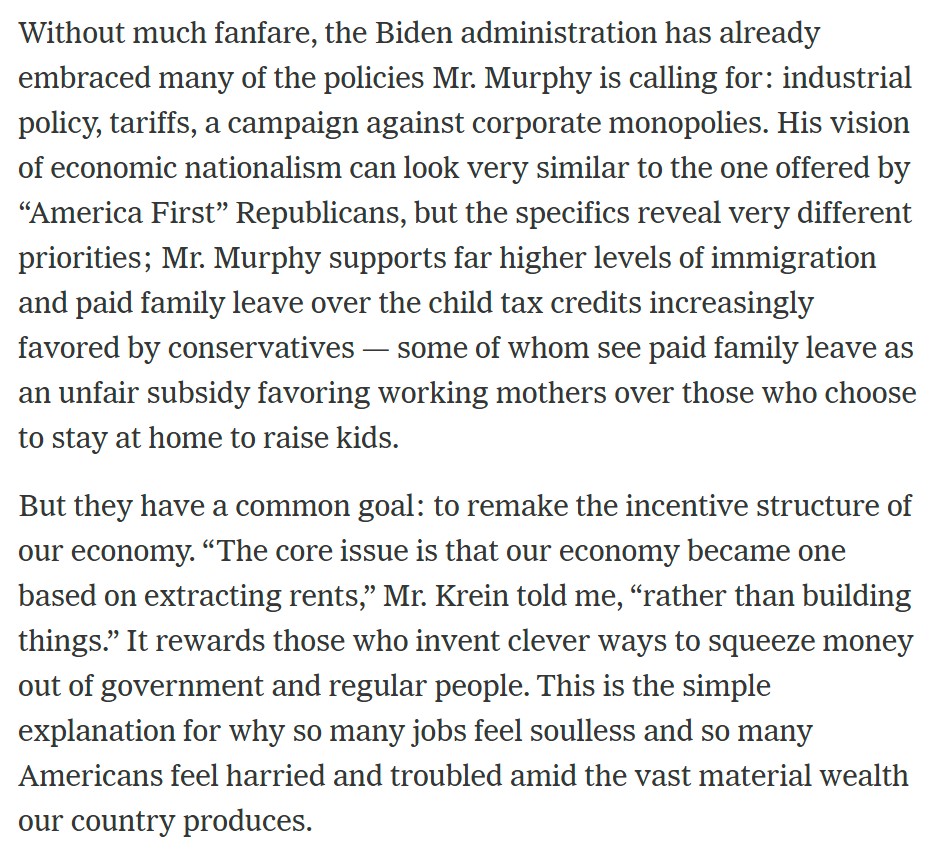 That’s a rather interesting statement, that the problems we face today aren’t logistical but metaphysical. Pogue then goes to say the subject of Murphy’s speech was “the fall of American neoliberalism.” I’ve read several articles over the last few years that mentioned the same thing. Neoliberalism is a virulent form of capitalism pushed by Ronald Reagan and Margaret Thatcher. It’s an economic philosophy embraced by Republicans, but Bill Clinton went along with it when he got his chance. So did Obama. It was Trump who appeared to put on the breaks Neoliberalism when he was elected, and Biden even followed Trump in some ways. So, some pundits are now suggesting the tide has turned.