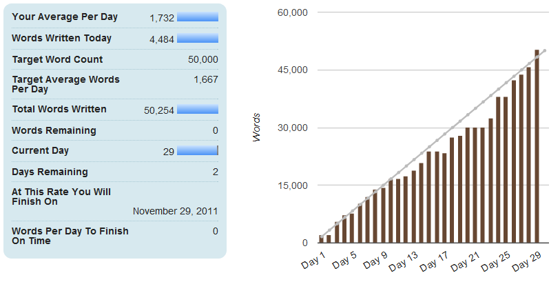 What I should do is publish my daily NaNoWrMo work here but that might screw up my chances of getting the novel published in the future. I’ve read that most authors have to write several novels before the get one good enough to publish, so maybe I’m being too protective of my first first draft. Also, I believe, and this might be naive, that I’ve got a unique science fiction idea and and I don’t want to spoil it by letting people read a first draft. However, I might be willing to show versions of the opening here as a marketing research to see if anyone responds.