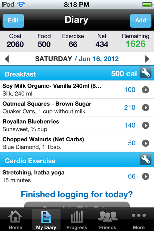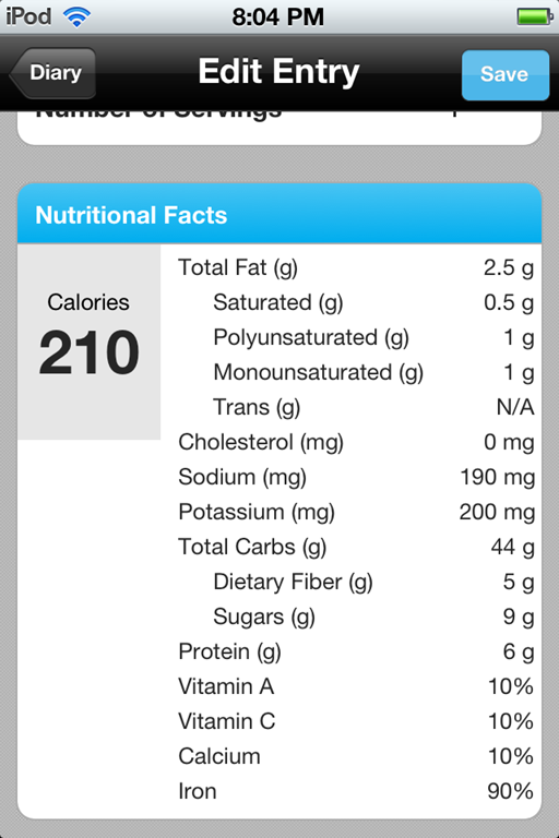 You can use both of these programs from the web if you don’t have a mobile device. I don’t have a smart phone but I do have an iPod Touch that I carry with me everywhere. It’s the current generation with a camera, so I can scan barcodes. It’s extremely easy to keep a food diary with these programs and a mobile device. It’s pretty easy to just use the web version, but it will be a bit more work because you have to run find a computer after you eat each meal, or jot down what you eat during the day and enter it at night.