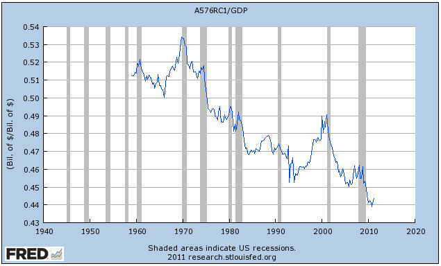 Things aren’t quite that simple and some of the Occupy Wall Street protesters know that. Look at “Here Are the Four Charts That Explain What the Protests are Angry About….” Here is one chart, click on the link to look at the others. This one shows the wages as a percent of the economy. Because we live in a global economy where all workers compete, the average wage is decreasing even though corporate profits are skyrocketing. This is the reason behind the whole 99% versus the 1%. Corporations are more efficient at making money, but at the expense of the workers worldwide.