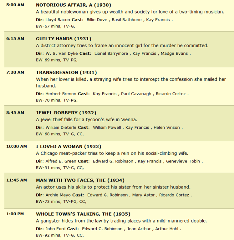 Using the ratings at IMDb, I picked the next dozen highest rated Kay Francis films. None of these films are going to be remembered by the public at large today, but they aren’t bad if you like old movies from the 1930s, especially Pre-Code films.