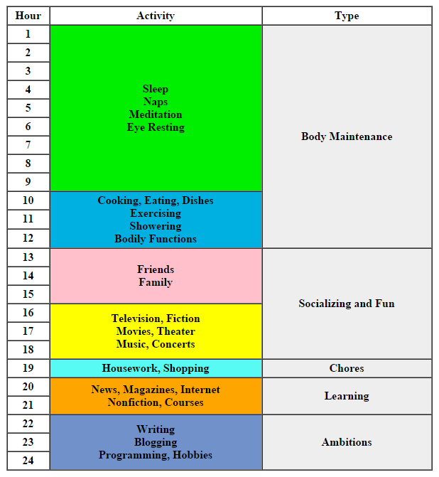 When I look at this schedule I realize why I’m not getting much writing done. Three hours a day feels about right for how I’m doing things now. I have to work hard to get those three hours. It’s very easy to just fill the day with all the other stuff. I could cut out two hours a day of television and give it to writing, but I’m not sure that would work. Watching two hours of TV before bed every night seems almost a necessity for my body and mind’s upkeep, as valuable as sleep and eating. My mind is shot for the last few hours of each day, so I don’t think I could do anything ambitious.