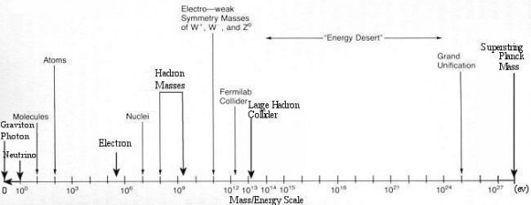 To “see” the very small requires what used to be called an atom smasher, but are now called particle accelerators.  The most famous one at the moment is the Large Hadron Collider (LHC).  It requires tremendous amounts of energy to see small.  Here’s another graph using the powers of ten, but this time using energy, to show how much energy it takes to see small.  You can click on both pictures to get larger versions.