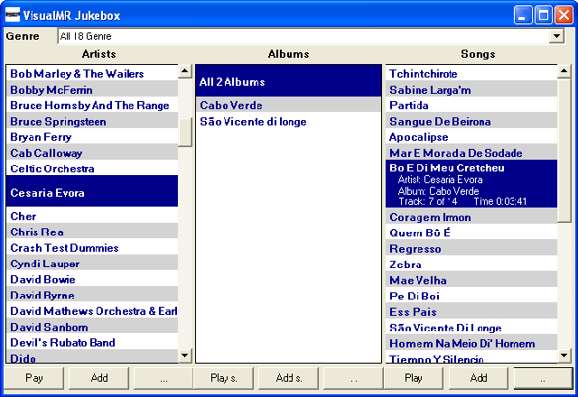 This display shows a listing of artists on the left, their albums in the middle, and the songs from the highlighted album on the right. And I can filter too, by genres. This very quickly lets me drill down into my collection and find songs and add them to the player queue. I can sit in my La-Z-Boy with my laptop on my lap and just lean back and play songs about as conveniently as I could ever imagine, other than using telepathic mind control over my computer.  VisualMR has been around a long time, but I didn’t have a laptop for the task before.  VisualMR will also work with PDAs.